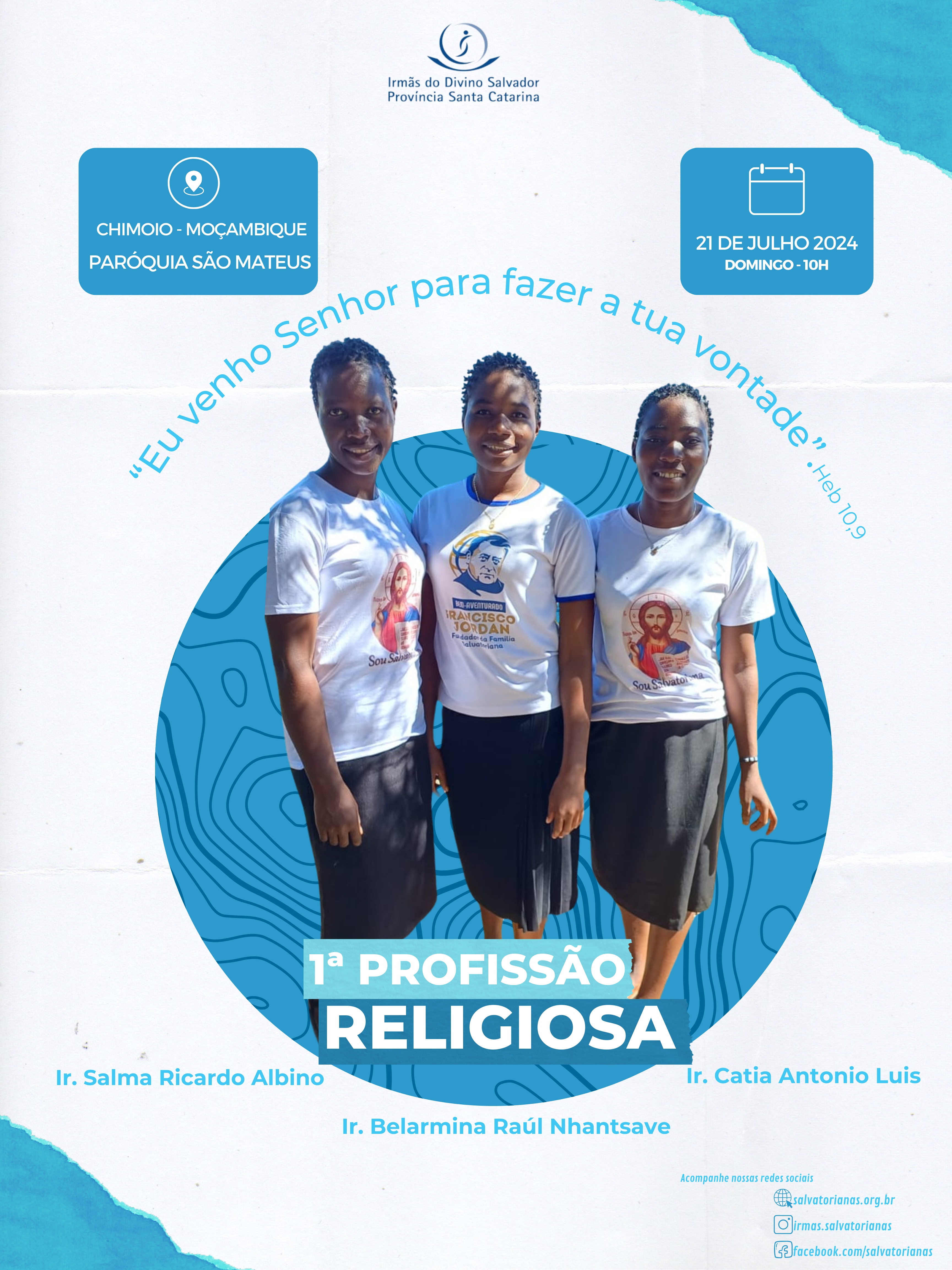 Aconteceu às 10h do dia 21 de julho, dia da Festa litúrgica do Bem-aventurado Francisco Jordan, na Paróquia São Mateus em Chimoio, Moçambique, a Primeira Profissão Religiosa, da Noviças Salma Ricardo Albino, Cátia Antonio de Luiz e Belarmina Raúl Nhantsave como Irmãs do Divino Salvador, Salvatorianas. Com muita fé e alegria as noviças confirmaram o seu SIM no Seguimento de Jesus Salvador, na entrega livre e alegre a Deus para servir ao povo, colaborando no anúncio da Boa Nova, para que Jesus Cristo seja conhecido e amado por todos. Como lema deste momento especial da caminhada, a Irmãs escolheram a frase: “Eu venho Senhor para fazer a tua vontade”, (Heb 10,9)