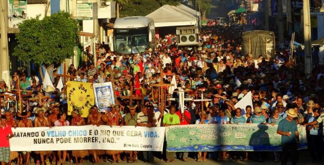 Ainda no sábado, 4, os romeiros caminharam até o Rio São Francisco para reflexão e proposição conjunta sobre a situação atual do Rio São Francisco. Todos foram alertados que o “rio São Francisco virou poeira, acabou a vida, só restam lágrimas na areia seca com rastos de pés descalços, sofridos, calejados a procura de água e peixes. Tudo acabou! O pequeno córrego que ainda resta, está procurando seu leito no meio de montanhas de areia. Os barcos dos pescadores que bem cedo partiam para buscar o sustento da família, agora só restam bagaço. Estão todos à margem parados. Tudo acabou. A vida do rio não está mais ameaçada, agora já está morta. Precisamos agir mais. Nosso rio precisa voltar.”