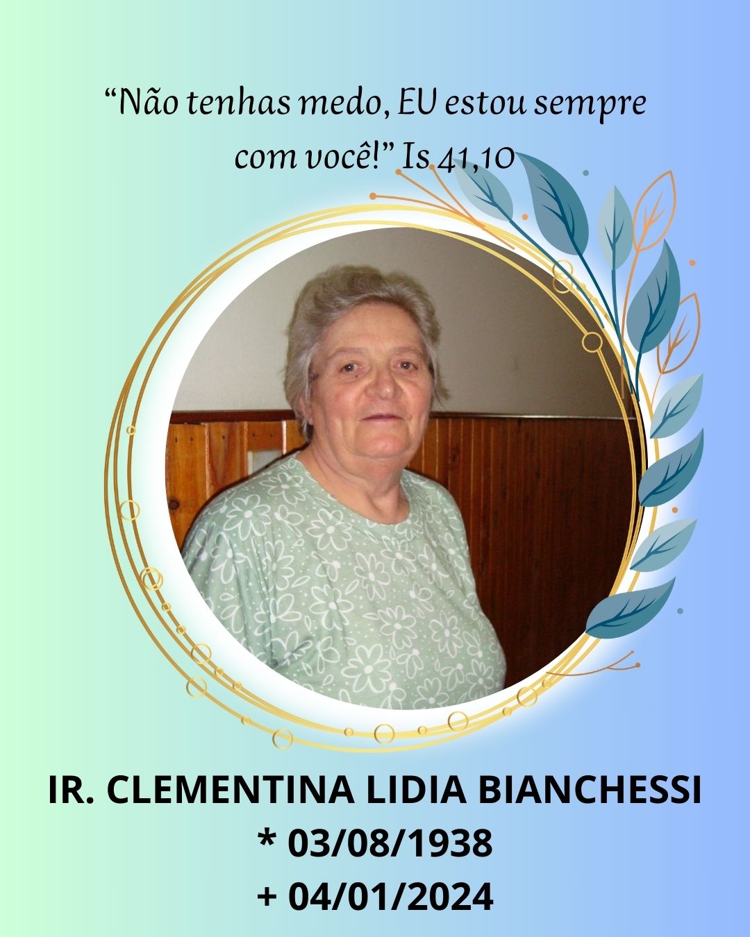 Nossa fé está fundamentada, alicerçada na ressurreição porque Deus nos criou à sua imagem para algo além do que nós podemos experimentar aqui e agora. Descanse em paz, Ir. Clementina Lídia Bianchessi. Damos graças a Deus Salvador pelo testemunho de vida que ela nos deixou.