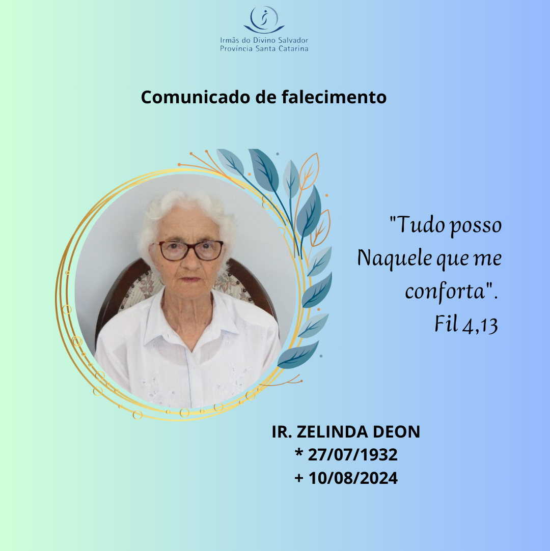 Ir. Zelinda! Gratidão pela vida vivida e partilhada entre nós e por tantos ensinamentos à nossa vida salvatoriana. Pedimos para que Deus na sua misericórdia infinita a receba em sua glória e interceda por seus familiares, por todas nós e pela humanidade que sofre.